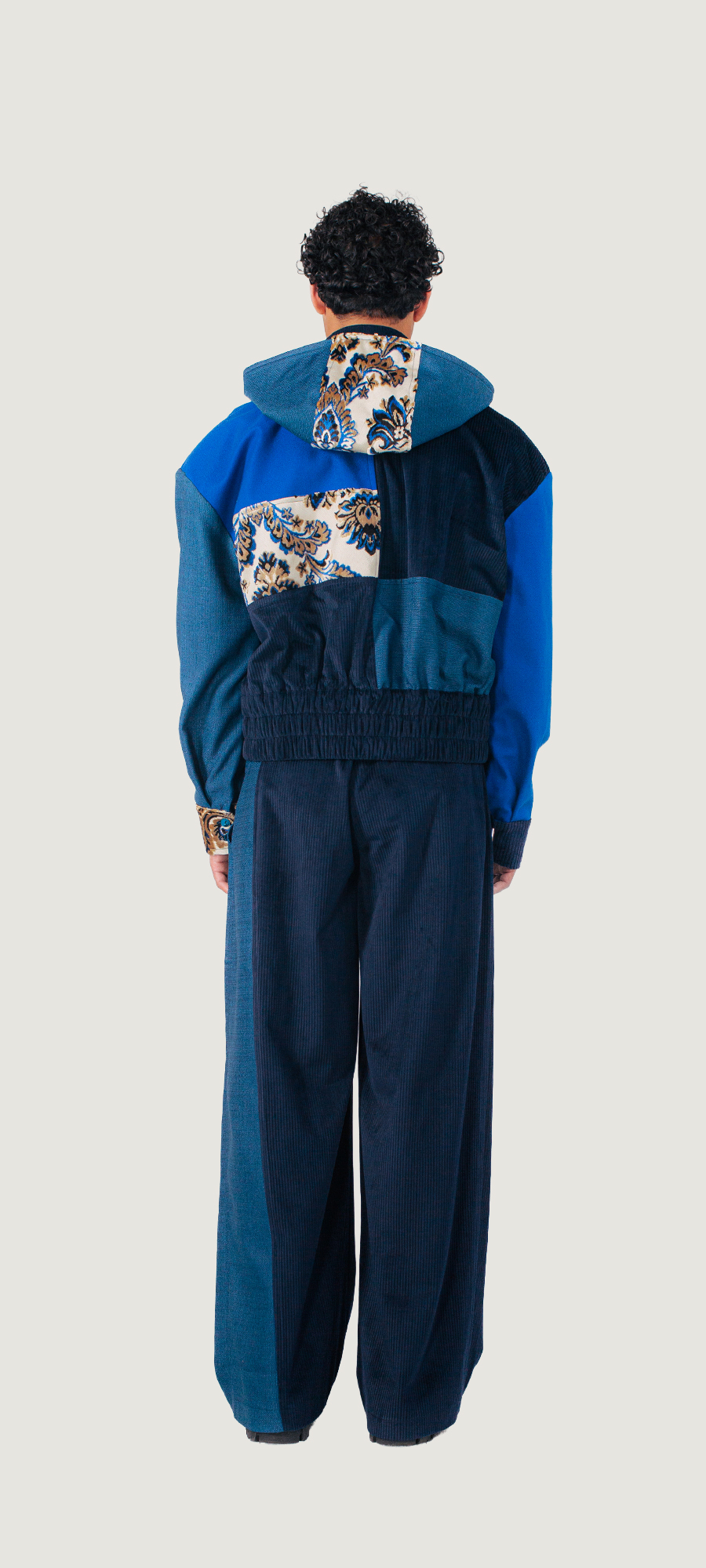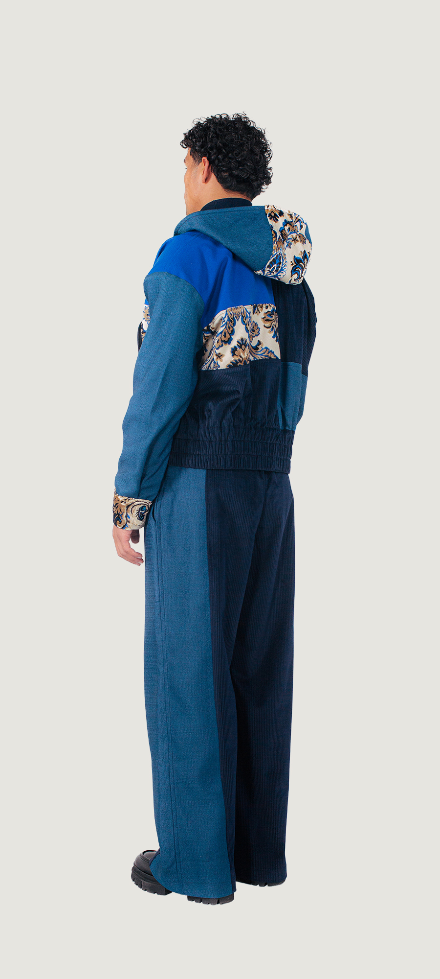 Gemaakt van tweedehands gordijnen en rest materialen van meubelmakers.