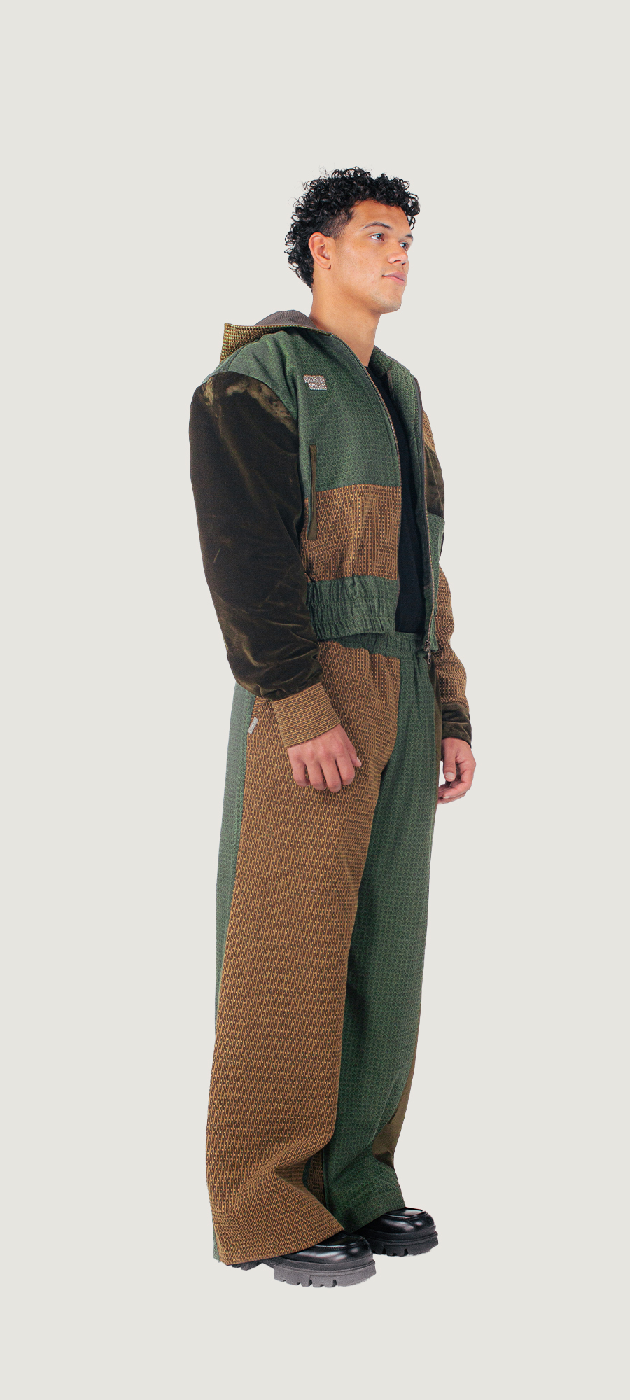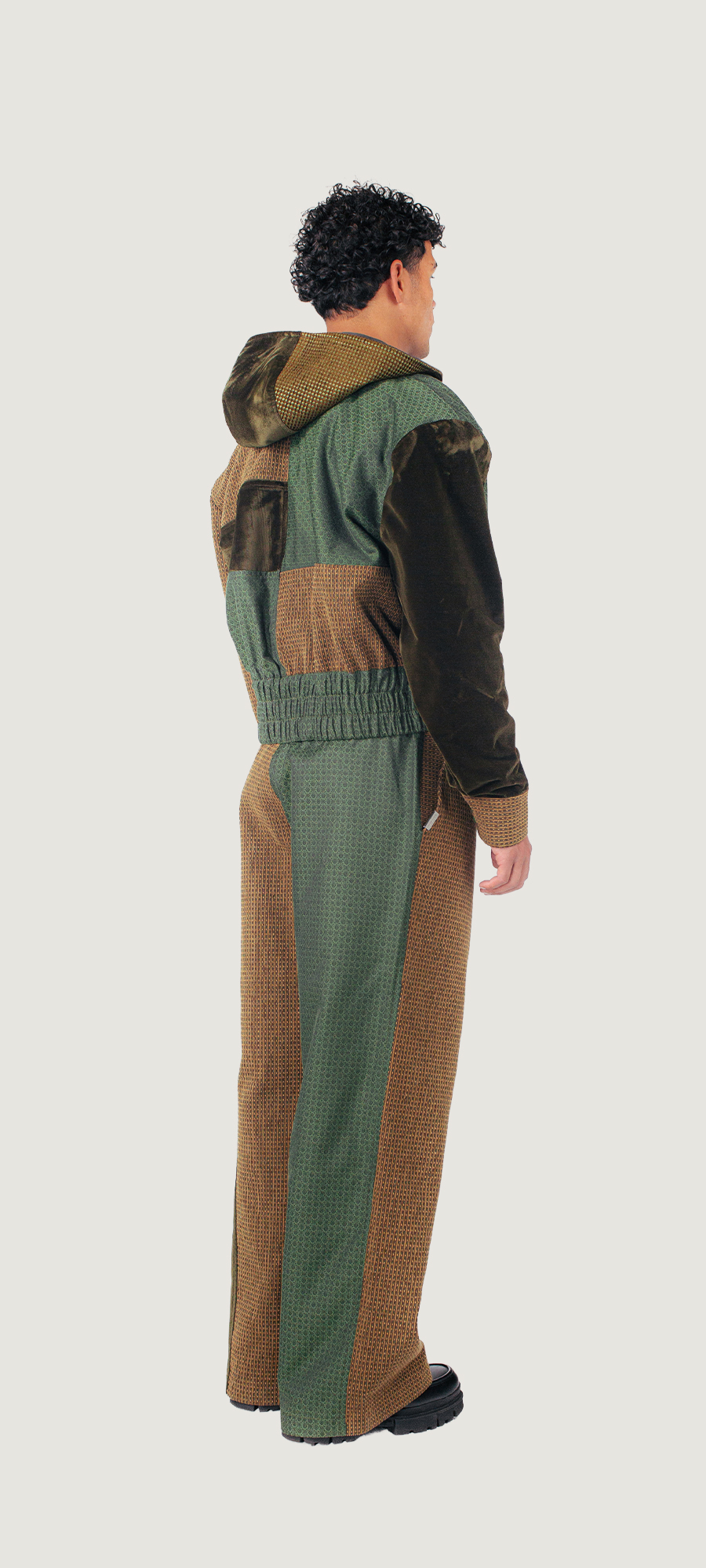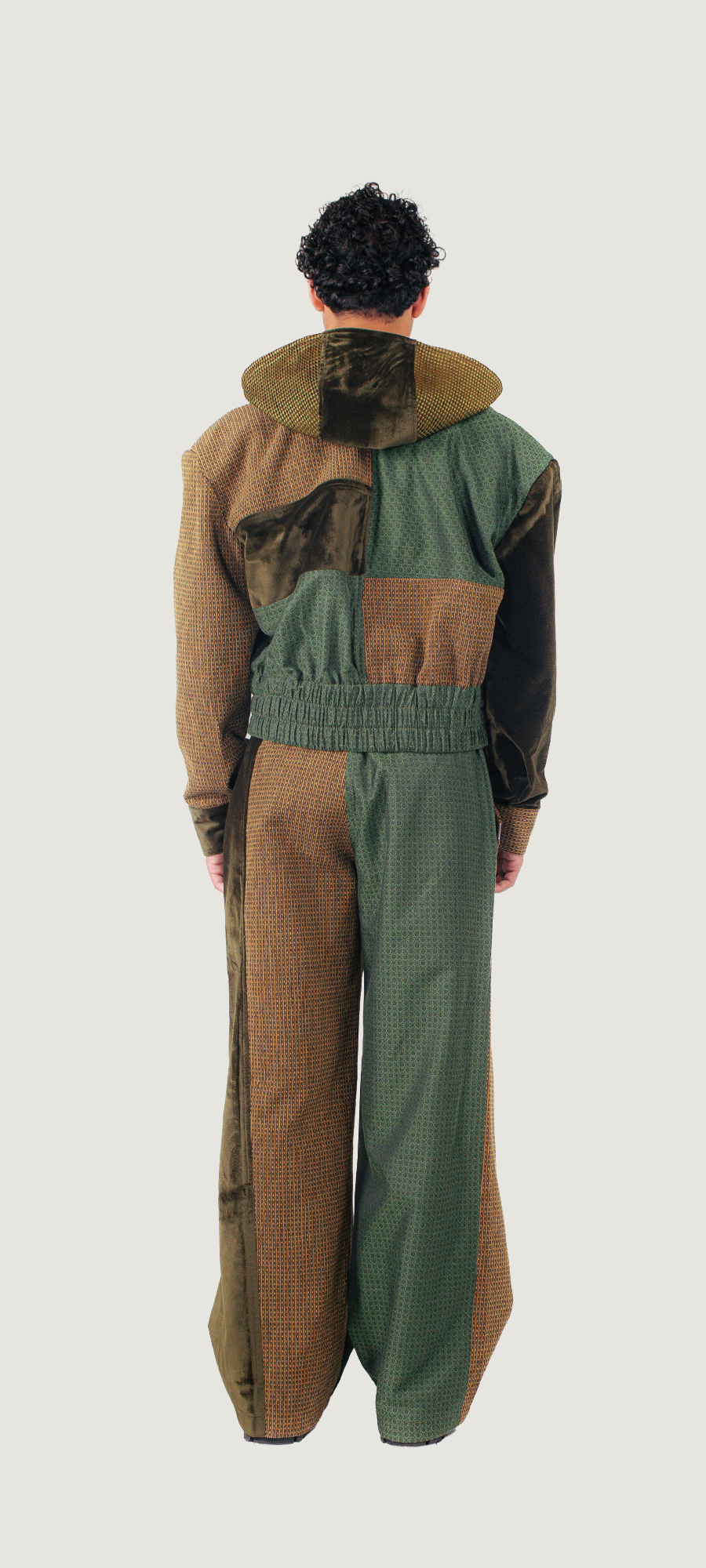 Gemaakt van tweedehands gordijnen en rest materialen van meubelmakers.