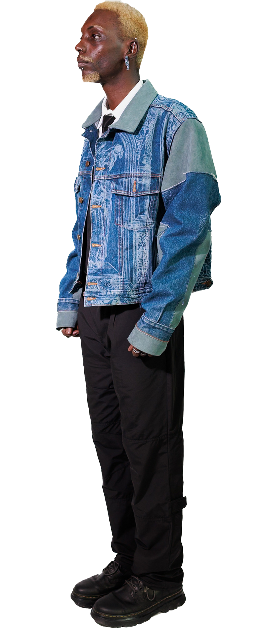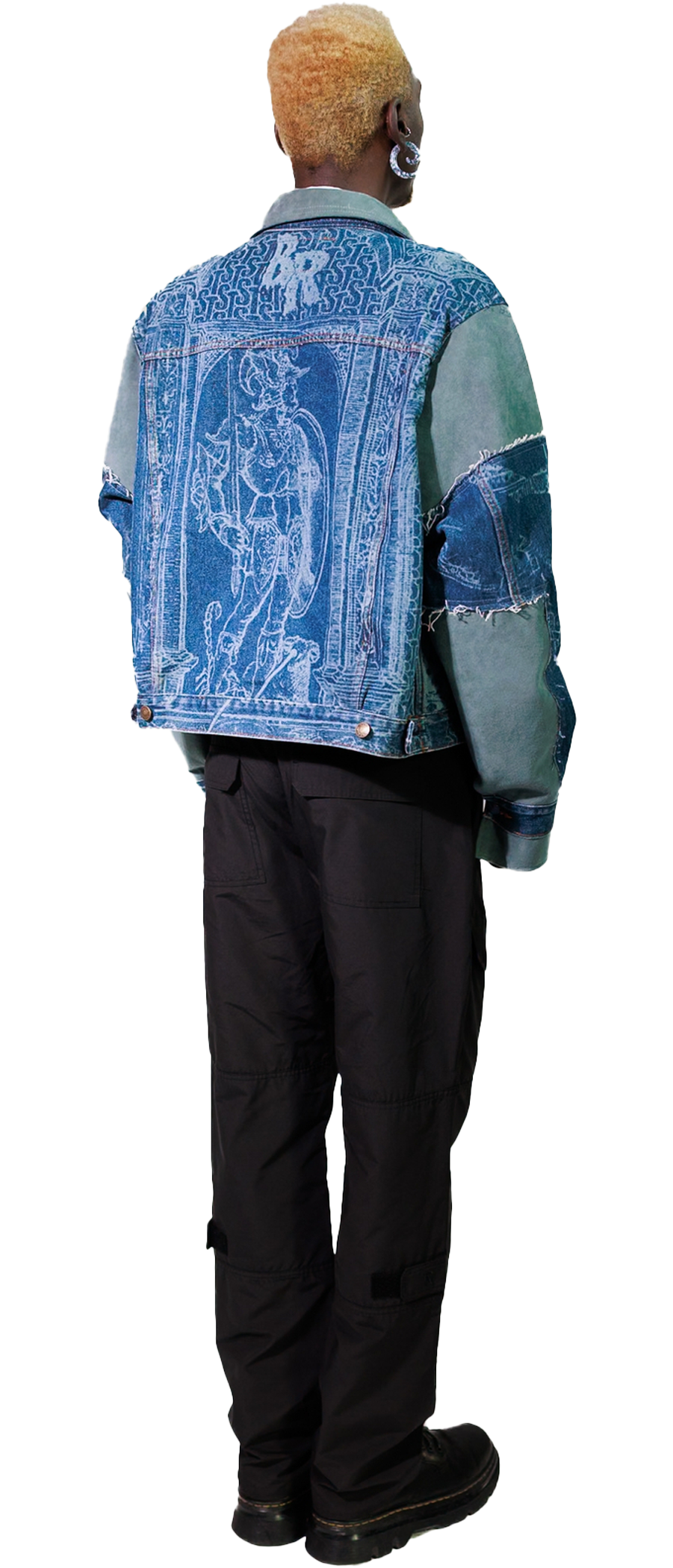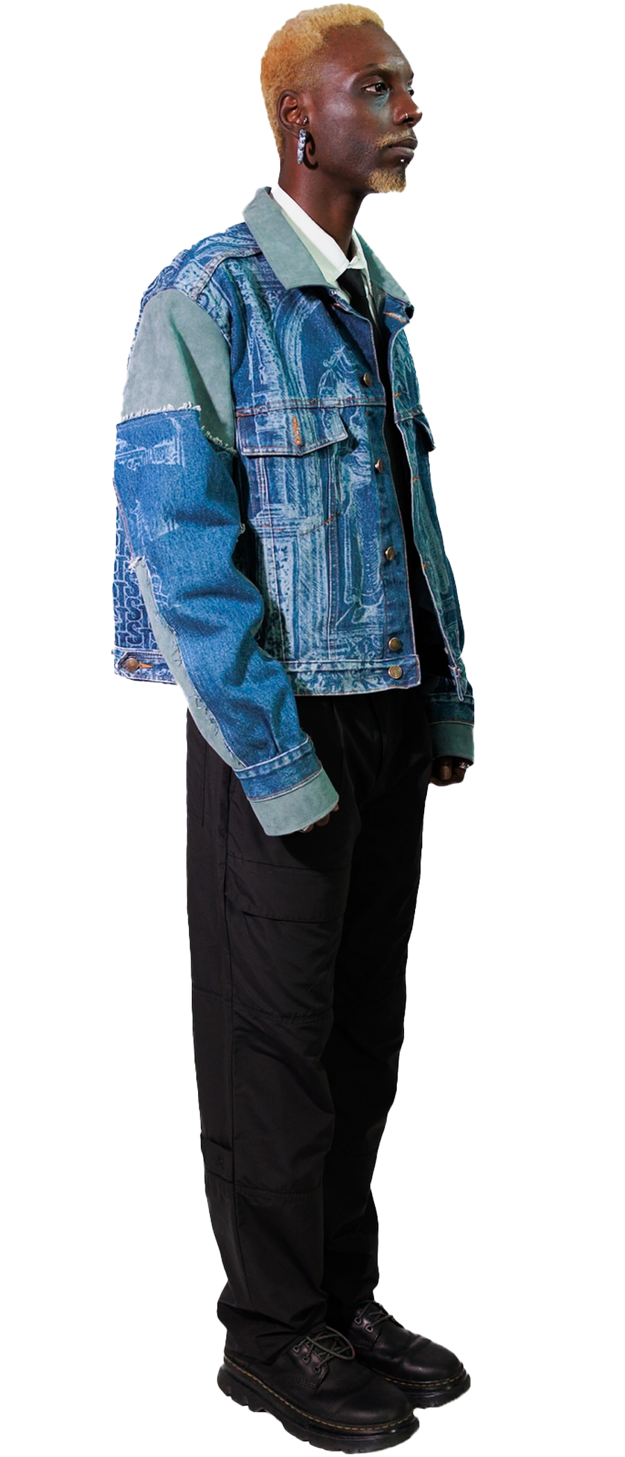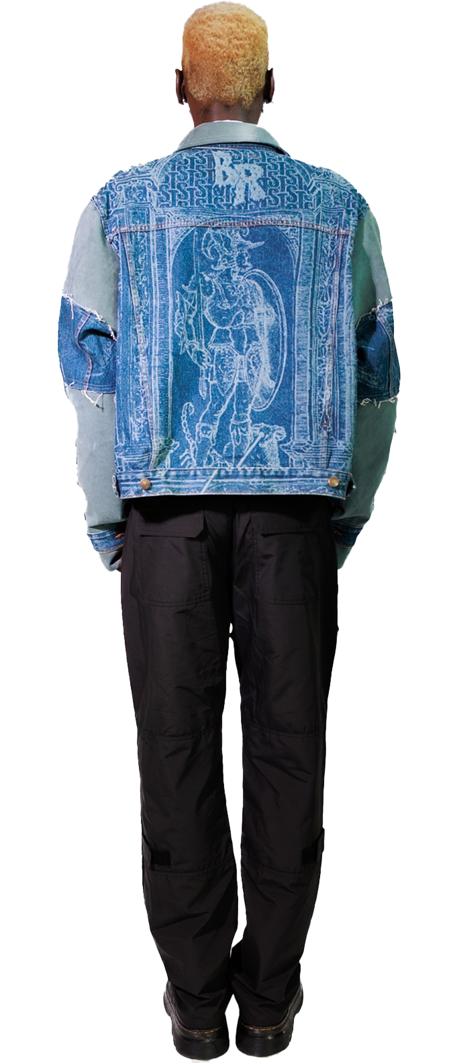 This upcycled, denim jacket features a laser-etched Renaissance motif, created in collaboration with Bleached Renaissance. The cropped, boxy silhouette adds bold structure, while eco-conscious Alcantara details at the sleeves, collar and cuffs bring a refined, soft contrast.