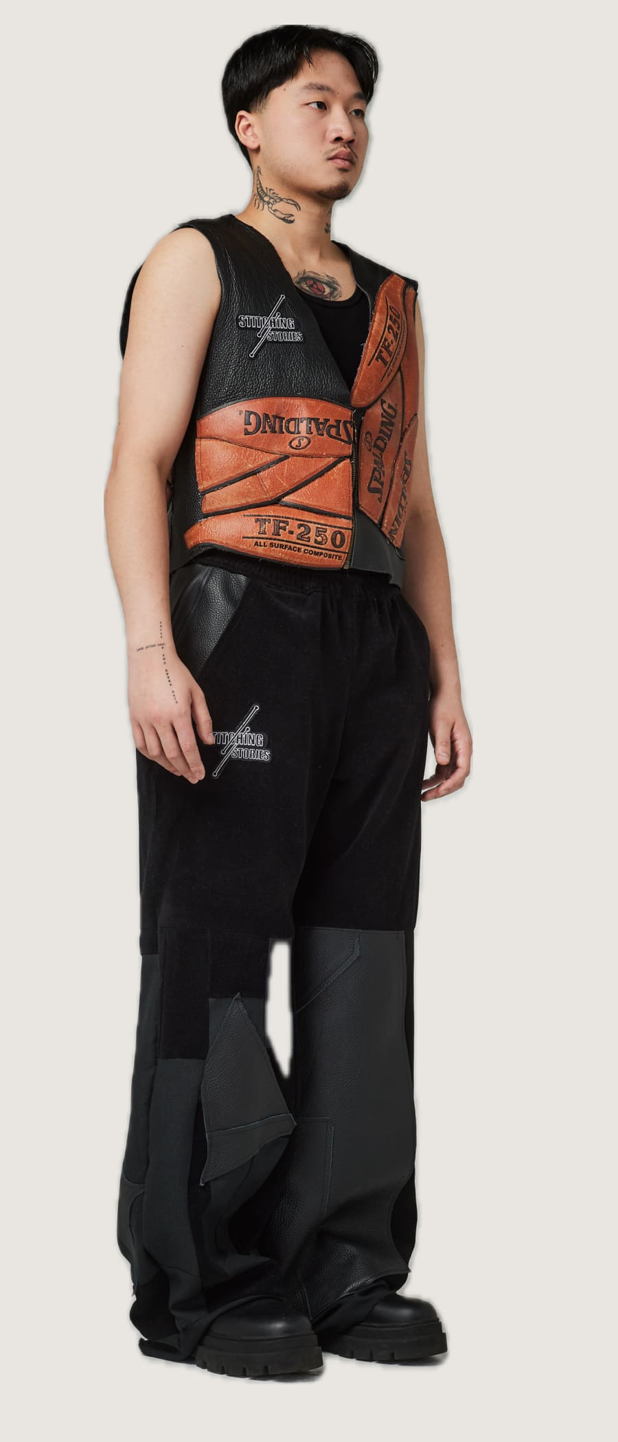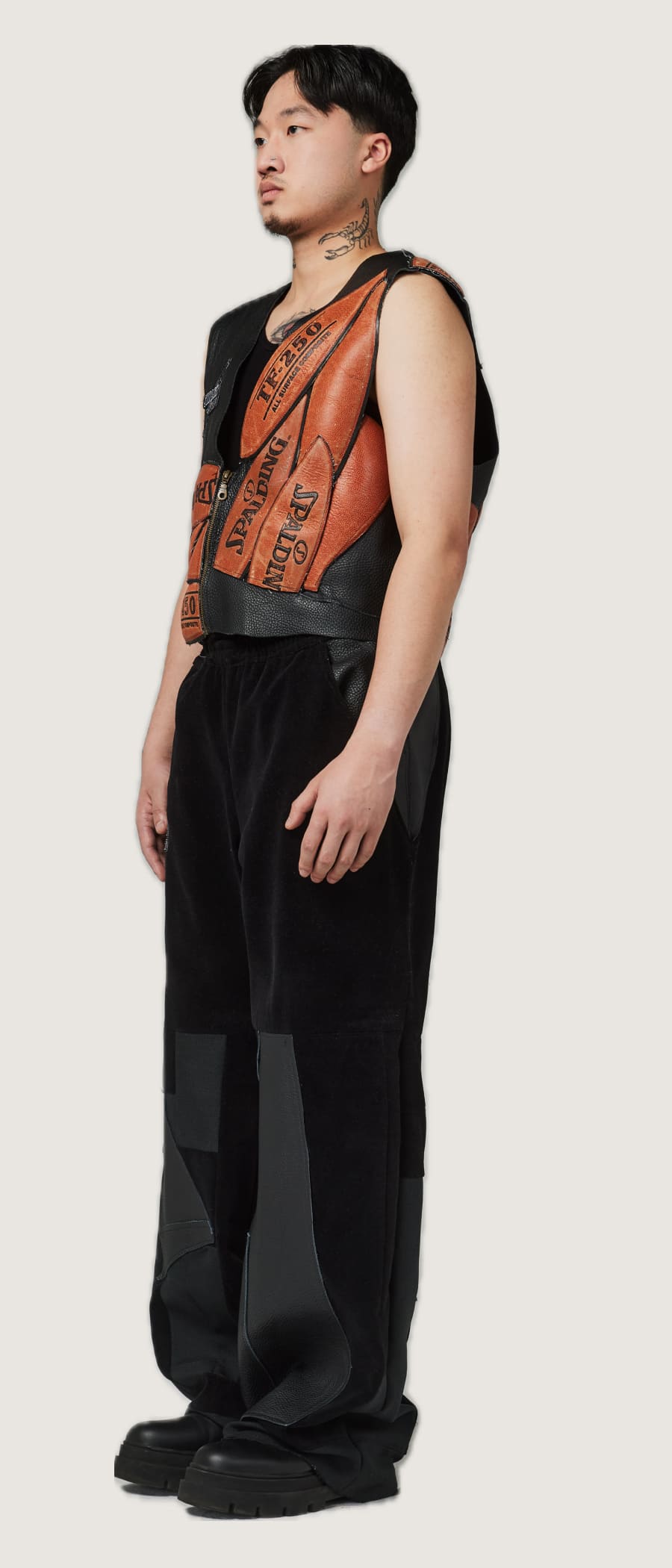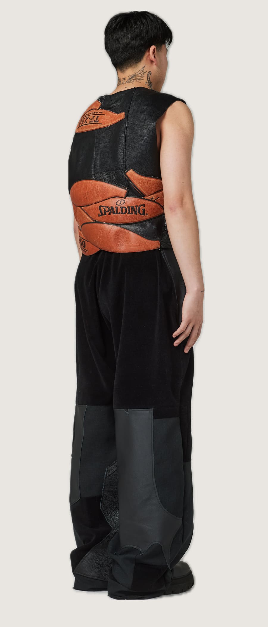 This gilet inspired by the Shattered Backboard, a sneaker that tells the story of Michael Jordan breaking the backboard of a basketball hoop with a dunk. This led us to create garments in the colors of the shoe, along with tracksuits accentuated with basketball lines, and even a waistcoat and corset made from a basketball.