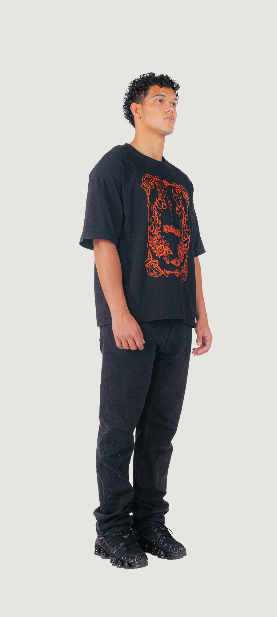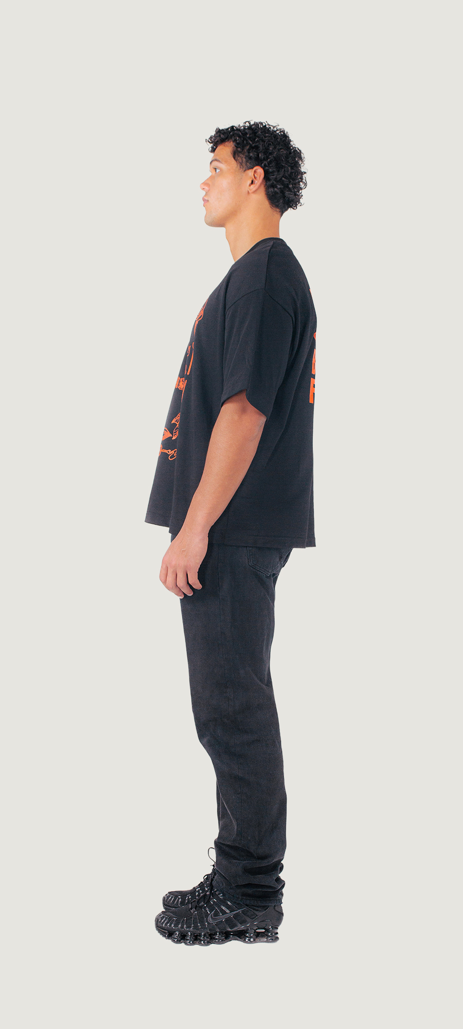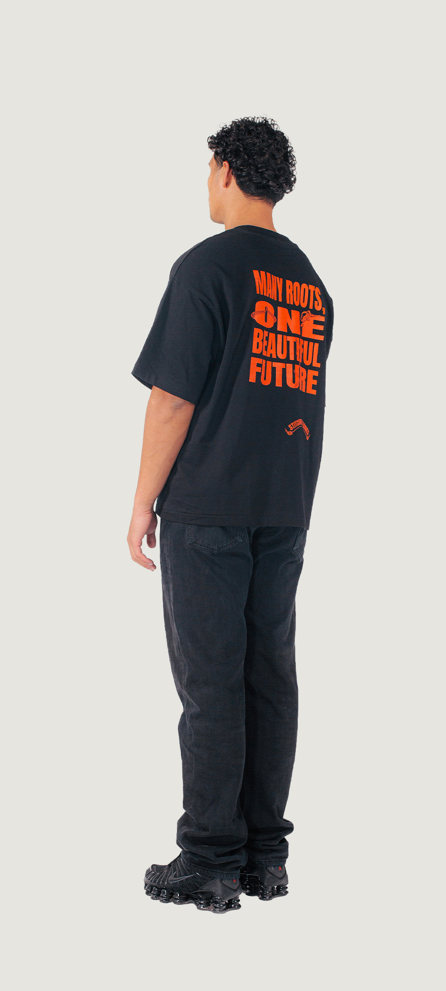 Dit shirt is een ode aan samenkomen. Surinaamse en Nederlandse elementen vloeien samen in een art deco stijl die symbool staat voor saamhorigheid, vooruitgang en zichtbaarheid.